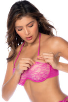 بيكيني متعدد الاستخدامات من قطعتين من الدانتيل الوردي الأنيق، مع جزء علوي بدون حمالات يمكن ارتداؤه كحمالة صدر لمزيد من الدعم، مع جزء سفلي برباط جانبي.