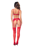Three-piece lace set features a bra, thong and garter belt. Garter and thong feature sexy heart designs perfect for a romantic occasion. Top has decorative bows, adjustable straps and a clip in the back. Thigh-highs not included but sold in our catalog.