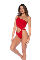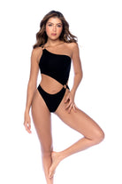 This one-shoulder one-piece swimsuit features a striking cut-out design through the center, enhanced with gold ring details for a touch of luxury. It offers an adjustable back and thong-style bottom for a flattering fit.